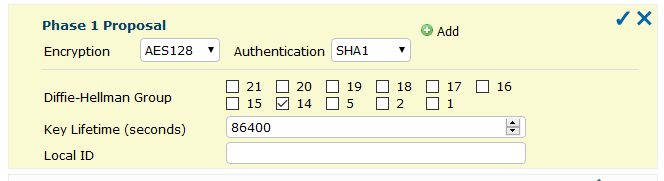 5. Phase 1 Purposal, set algorithms to AES128 and SHA1, with DH 14.