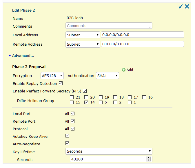 7. Set Encryption to AES128/Sha1, Replay Detection and PFS enabled, along with DH14. Enable Autokey Keep Alive, and Auto-Negotiate, and save changes.