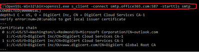 3) C:OpenSSL-Win32bin> openssl.exe s_client -connect smtp.office365.com:587 -starttls smtp