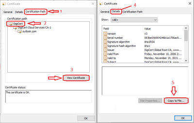 7) Now from here select the Root Certificate, in this case, ‘DigiCert Cloud Services CA-1’. Export the certificate and save it.