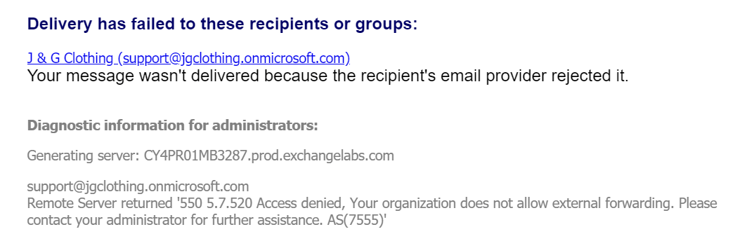 550 5.7.520 Access denied, Your organization does not allow external forwarding. Please contact your administrator for further assistance. AS(7555)