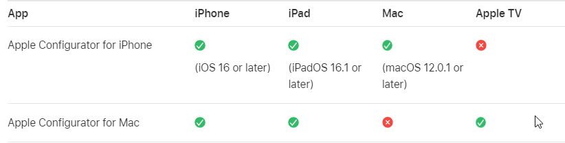 - iPhone, iPad, and Mac computers (running macOS 12.0.1 or later) with Apple silicon or the Apple T2 Security Chip using Apple Configurator for iPhone.
