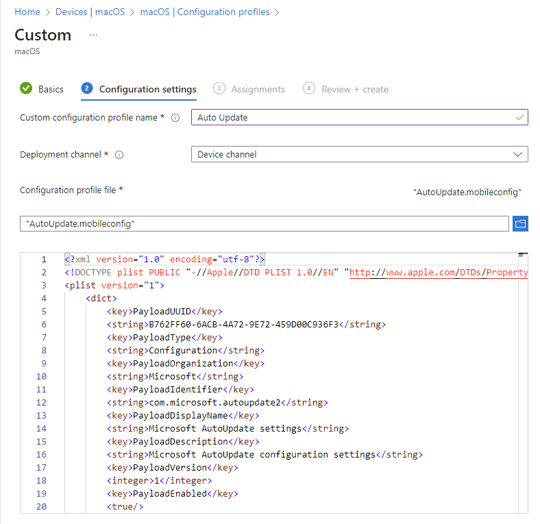 - On the Configuration settings tab, enter a Custom configuration profile name e.g. Auto Update